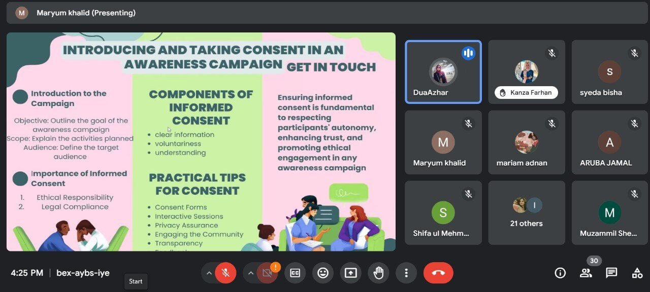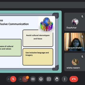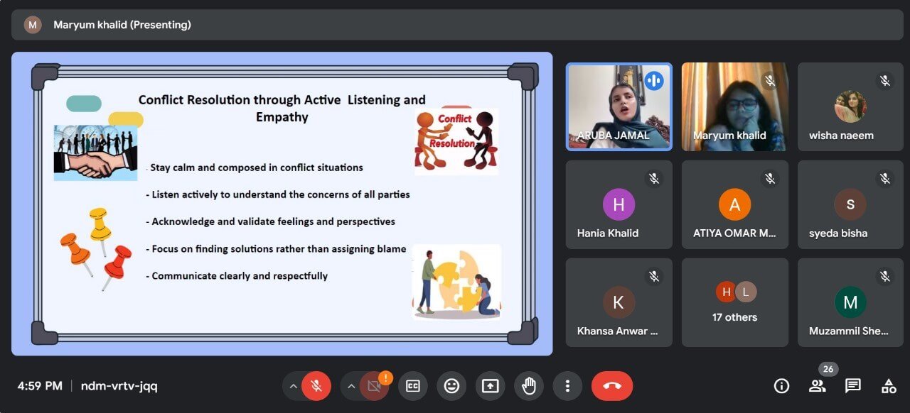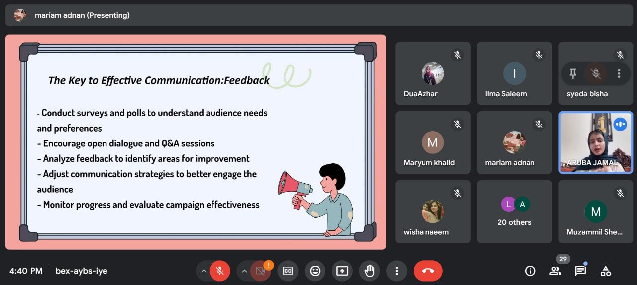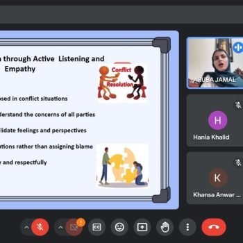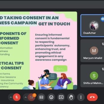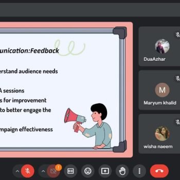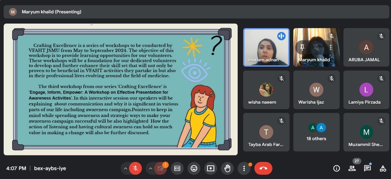 On June 26, 2024, VFAHT-JSMU held the third session of its “Crafting Excellence” series titled “Engage, Inform, Empower: A Workshop on Effective Presentation for Awareness Activities.” Led by mentors Aruba Jamal, Dua Azhar, and Maryum Khalid, the workshop equipped participants with techniques for delivering engaging, clear, and impactful presentations.